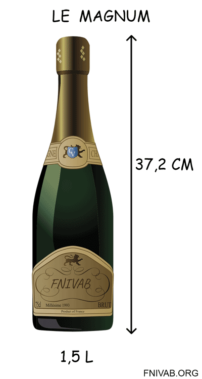 Le Magnum de champagne contient 1,5 litre du précieux breuvage et peut remplir au moins 12 verres. C’est l’équivalent de 2 bouteilles ‘classique’.