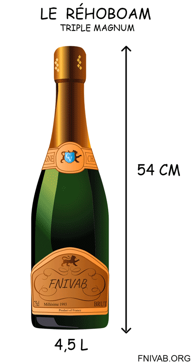 Le Réhoboam contient l’équivalent de 6 champenoises, soit 4,5 litres. On peut remplir 36 verres de champagne avec cette bouteille. Son nom vient de Roboam, fils du roi Salomon dans la bible.