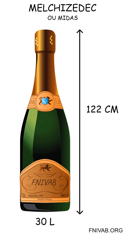 D’une taille de 122 centimètres, le Midas de champagne est le plus grand contenant de champagne existant. Cette bouteille contient 30 litres de champagne c’est à dire 36 bouteilles de 75 cl. La taille de cette bouteille est de 122 centimètres. Le Midas de champagne est aussi appelé le Melchisédech de champagne. Melchisédech était un personnage secondaire de la bible qui apparait de manière brève. Le roi Midas et son or apparaissent dans de nombreuses légendes de la mythologie grec.