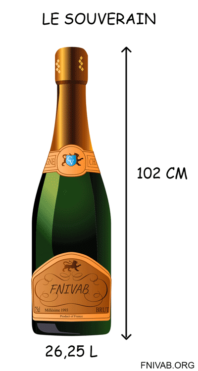 Avec cette bouteille à forte contenance, on peut remplir 210 coupes. Il faudrait 35 bouteilles de 75 centilitres pour remplir autant de verres. La bouteille contient 26,25 litres de liquide.
